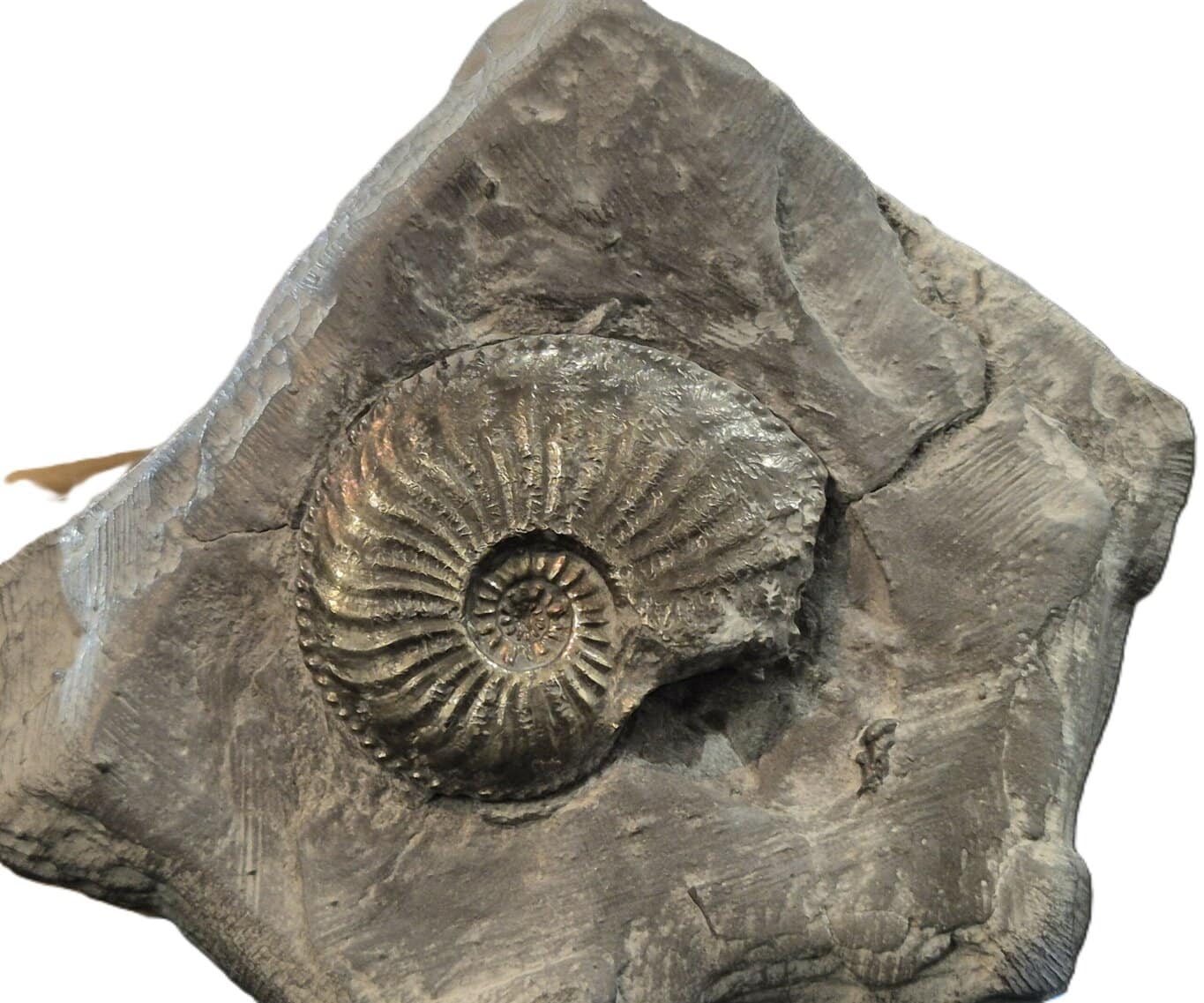 Amaltheus margaritatus sur guangue. Belle taille. Les ammonites sont un type de mollusque marin préhistorique. Elles ont vécu pendant une vaste période de plus de 300 millions d’années. Leur existence part de la période dévonienne à la fin du crétacé. Elles ont disparu en même temps que les dinosaures, il y a 65 millions d’années. Denos jours leur histoire se retrouve gravée sur toute la terre sous formes de fossiles. Au cours de leur existence, les ammonites se sont transformées en milliers d’espèces, s’adaptant aux différents environnements marins, des plateaux peu profonds jusqu’aux profondes abysses océaniques. Les ammonites , ou Ammonoidea, sont une sous-classe éteinte des mollusques céphalopodes(famille des calamars). Elles apparaissent dans le registre fossile durant le Dévonien et disparaissent peu après la crise Crétacé-Paléogène. Elles se caractérisaient par une coquille plus ou moins enroulée dont la dernière loge uniquement était occupée par l’animal. Les autres loges servent à contrôler sa flottaison; le siphon qui les relie est en position externe, le long de la paroi (axial chez les nautiles). Leurs coquilles fossiles sont d’excellents marqueurs chronologiques. Leur taille va de quelques millimètres à plus de 2 mètres de diamètre. Durant le Callovien, les faunes d’ammonites se renouvellent de façon importante et l’on observe en Charentes la diversification de certains genres et la succession de nombreuses lignées. Cette proliférence est particulièrement observable dans la région de Ruffec en charentes et le département des deux sèvres. Son plus proche descendant serait le nautilus, le poulpe, le calmar, et la seiche. Leur nom provient de leur forme en spirale qui évoque les cornes de béliers. Pline l’Ancien les appelait “les cornes d’ammon”, faisant référence au dieu égyptien Amon que l’on représentait avec des cornes de bêlier.
