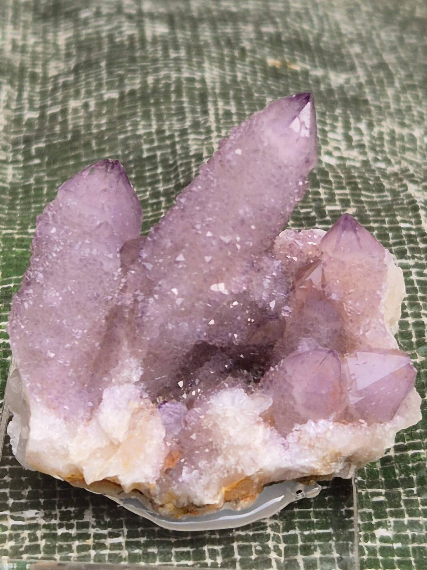 Améthyste Cactus:Mauve pâle à lavande foncé. Origine de la couleur :Traces de fer (Fe)