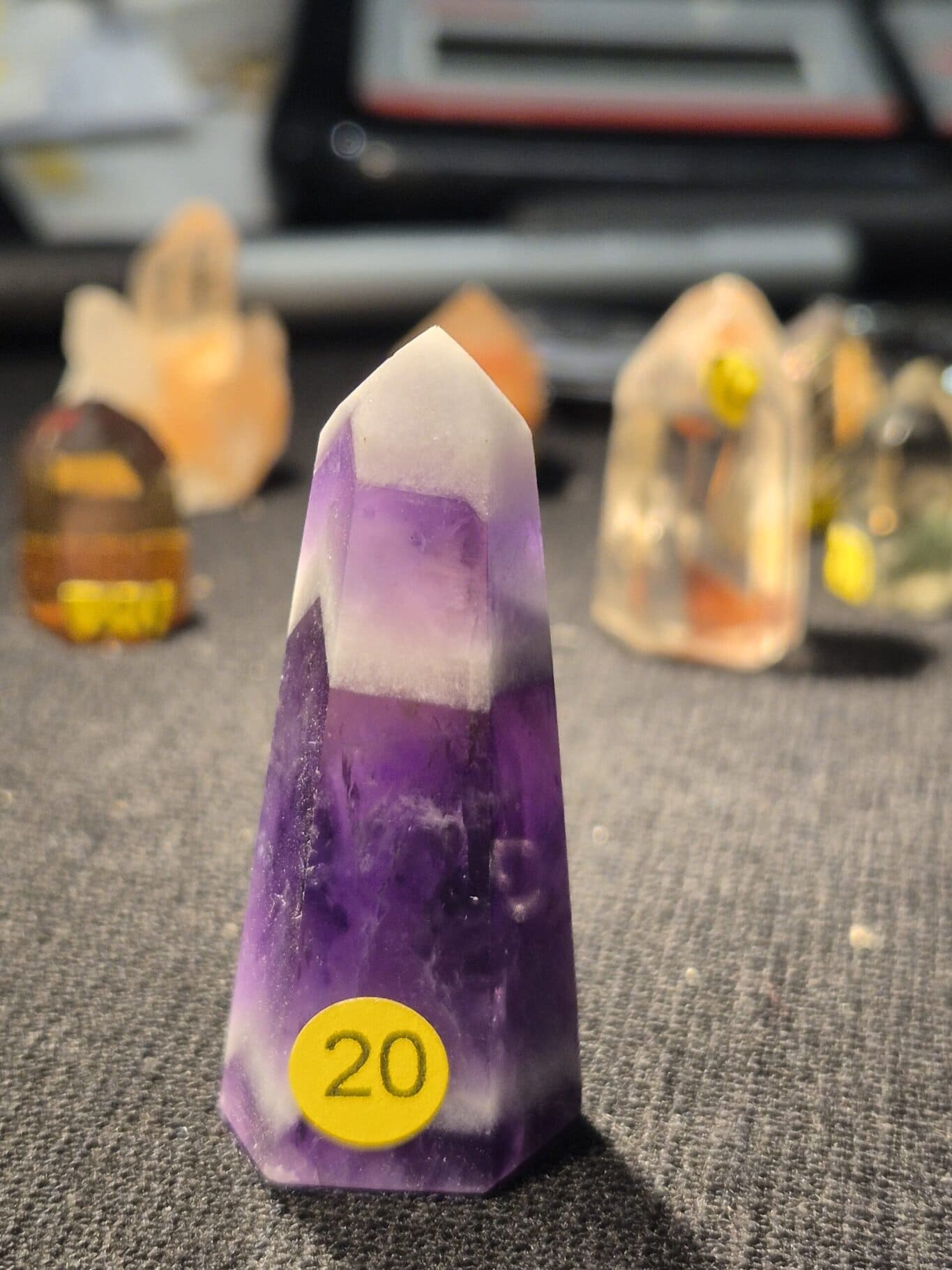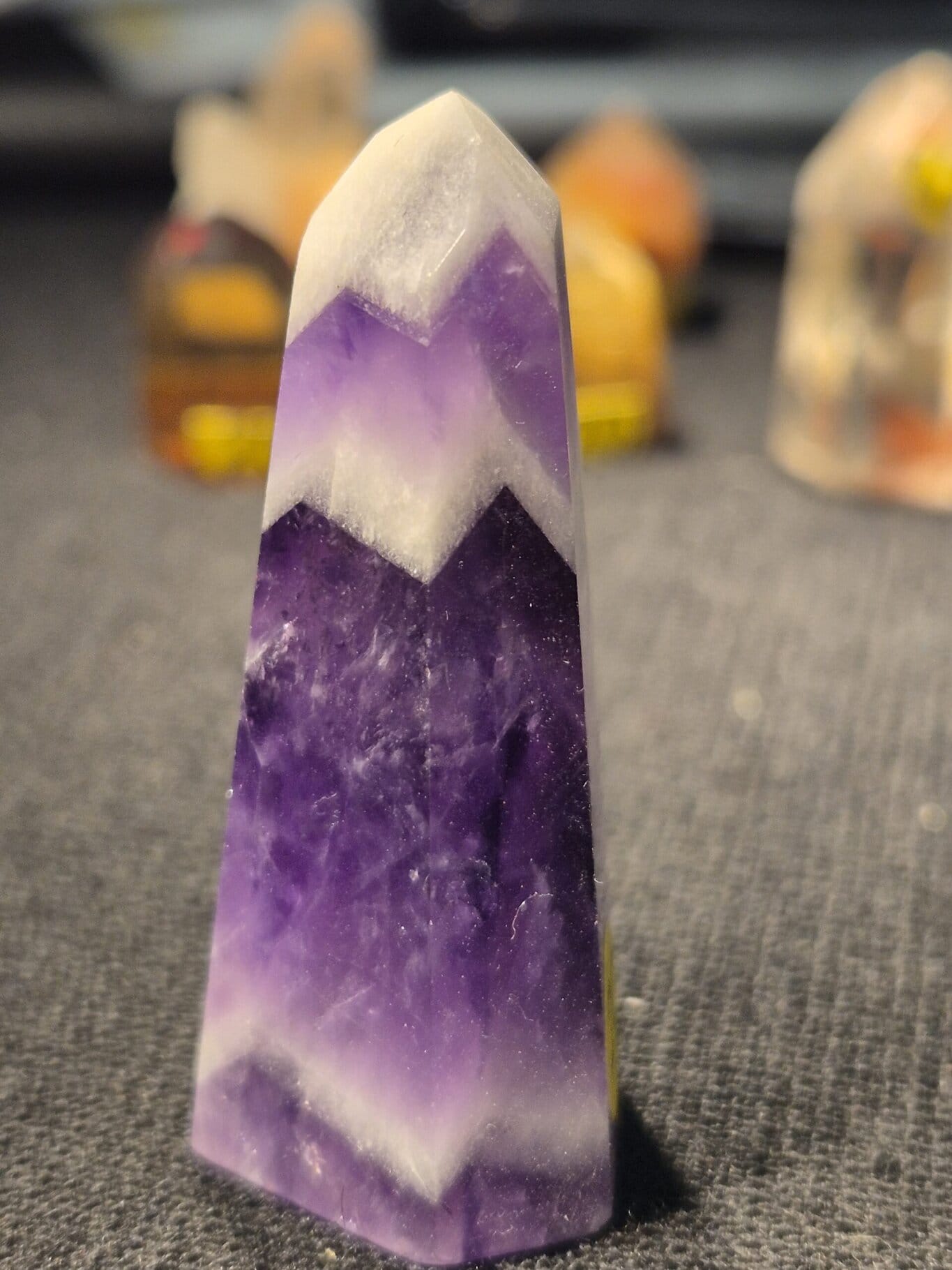Améthyste chevron obélisque. C’est une pièce d’art lapidaire qui met en valeur un objet de décoration apprécié pour son motif géométrique. Brésil.