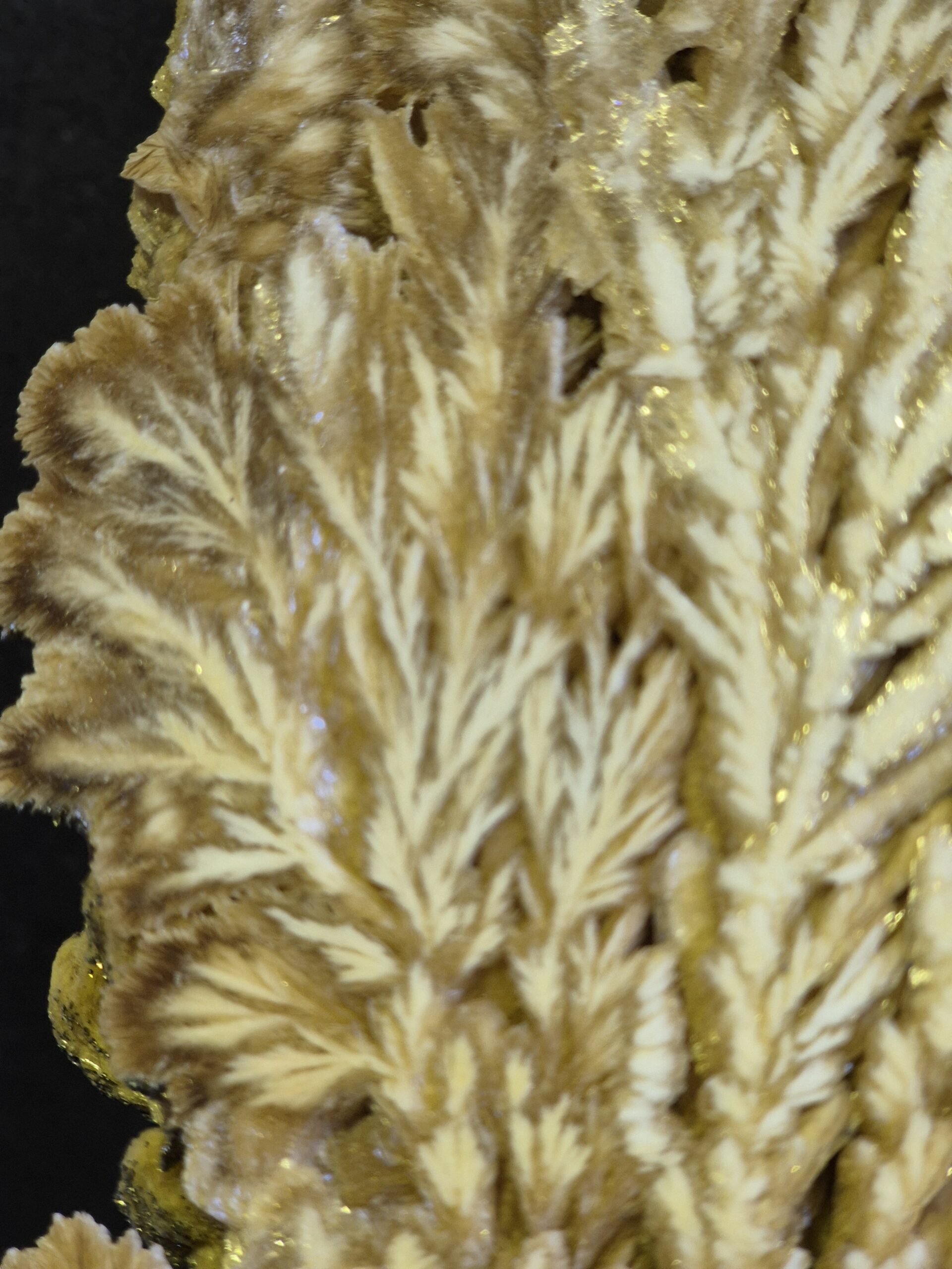 Ces beaux tons chauds de marron et or sont une cristallisation de Marcasite autour d’un nodule de Baryte. Ces minéraux arrondis (botryoidal) viennent de la mine de Lubin en Silesie Polonaise, ou plus de1000 personnes travaillent dans ces mines de cuivre et d’argent. A l’extraction les mineurs découvrent parfois des poches creuses dont les parois sont tapissées de nodules de Baryte beige/brun qui forment des mini collines, et qui ont été recouverts d’une couche de Marcassite (Bisulfure de fer). On reconnaît la forme caractéristique en lamelles des cristaux de Baryte au cœur des nodules.