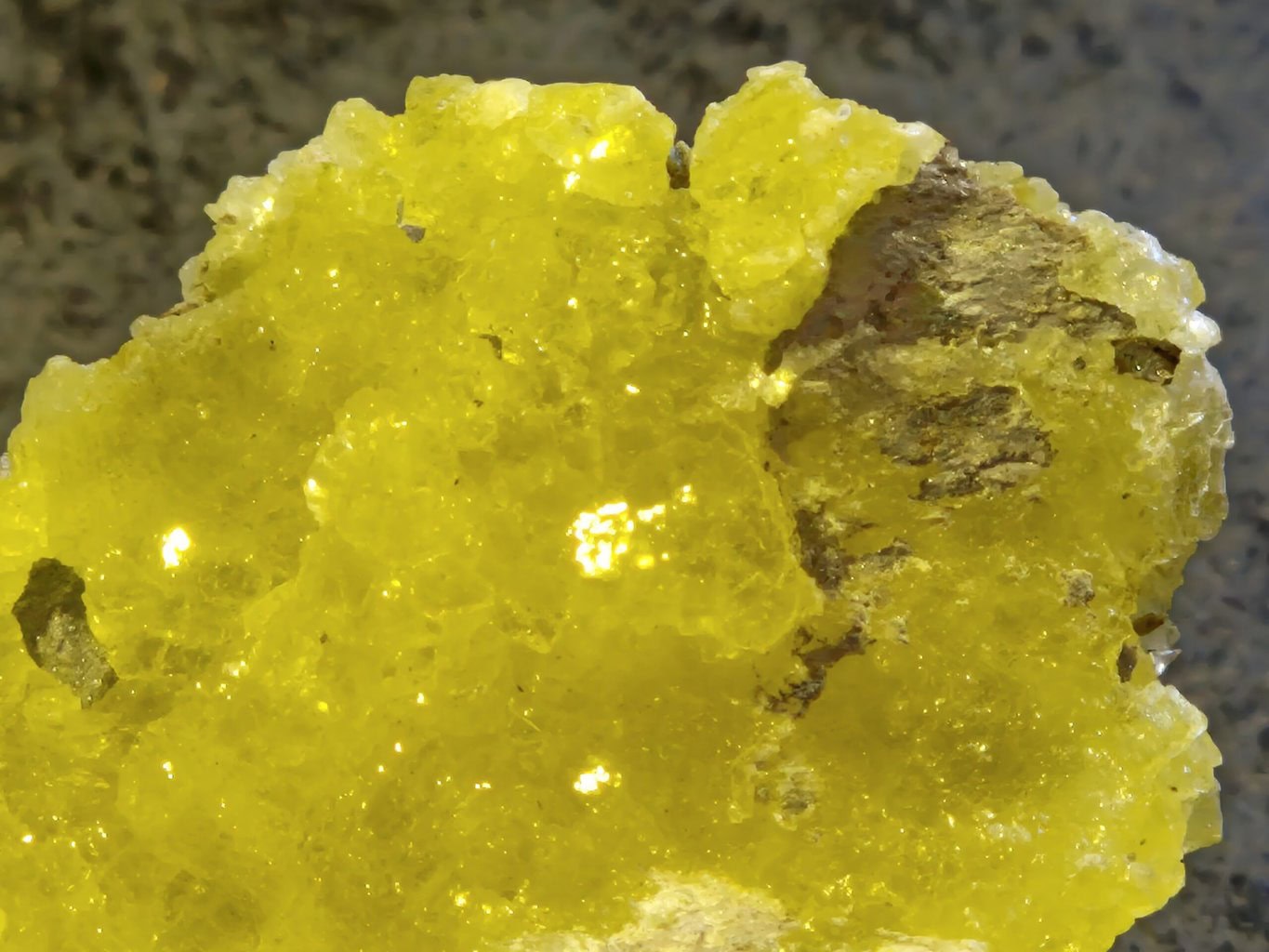 - Sa couleur: Souvent d’un jaune éclatant, parfois translucide, elle offre un contraste saisissant avec les minéraux environnants.