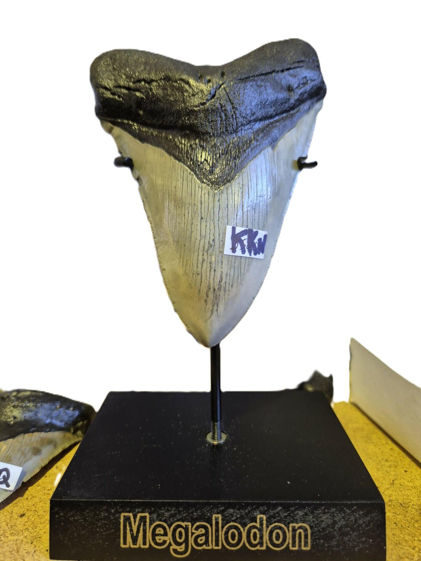 Dent de requin Megalodon. Ces spécimens provenants de requins fossiles se trouvent en pratiquant la plongée sur les dépôts de sables sous marins en bordure de la côte de north caroline aux USA. Les courants marins fréquents déplacent les grains de sable qui usent et polissent la face exposée à l’érosion . Ce qui explique la différence de couleur entre le recto et le verso qui lui est protégé des agents érosifs. Parfois des coquillages perforateurs (phollades) s’installent dans le fossile et y laissent des cavités . On a même vu des coraux végétaux s’ implanter sur des dents plus lourdes! Les forts courants marins présents dans la zone déplacent les dunes sous marines qui laissent apparaitre les fossiles! Afin de raccourcir le temps passé sous l’eau , économiser l’oxygène des bouteilles et rentabiliser le travail certains plongeurs utilisent des aspirateurs ou souffleurs . Ce processus très risqué attire d’autres requins très vivants ceux là , qui bénéficient d’eaux troubles pour s’approcher des chercheurs mettant leur vie en danger. Quelques grosses frayeurs et accidents même ont marqués la vie de ces plongeurs!