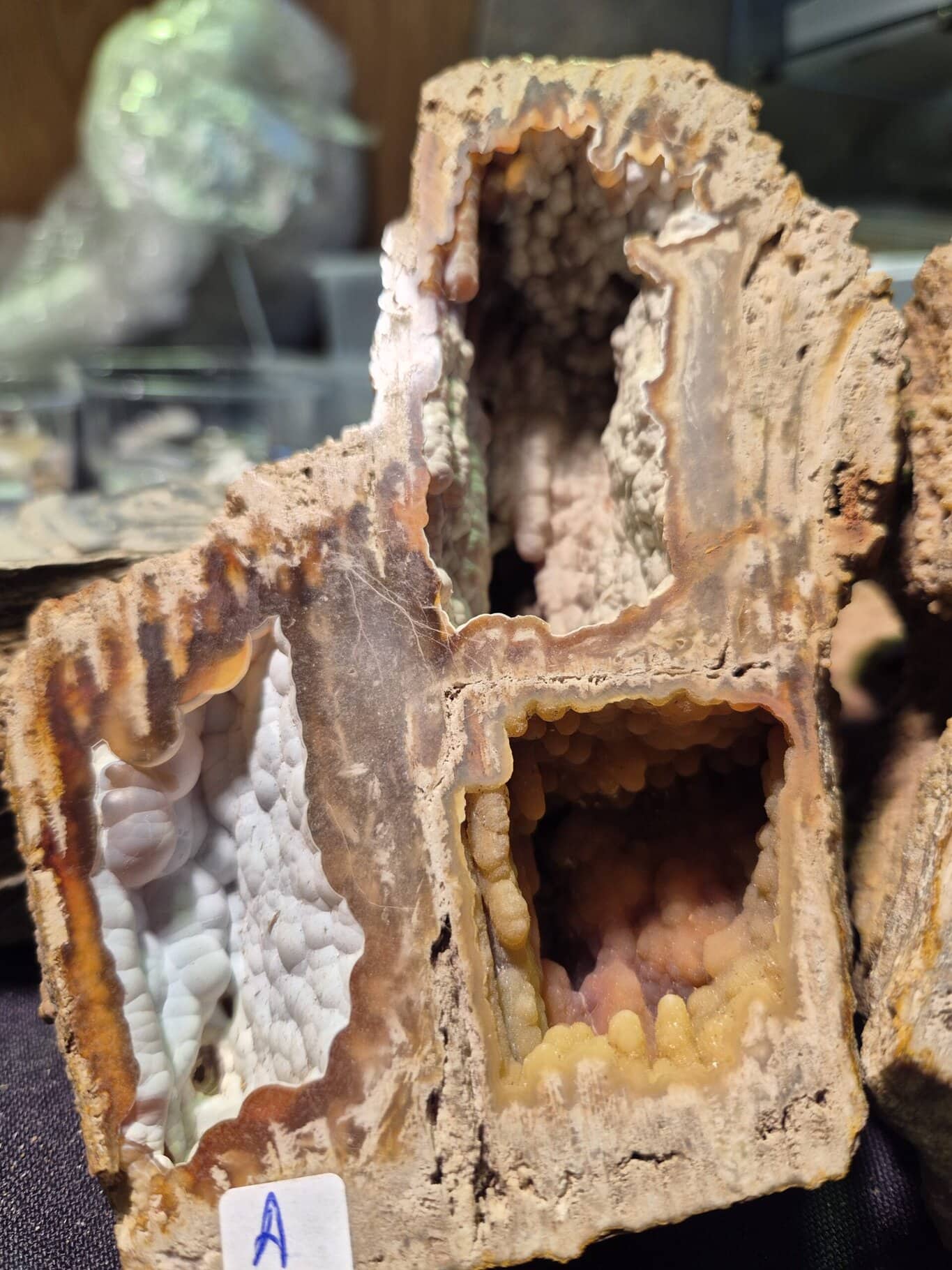 Ce corail fossile date du Miocène (25 à 32 millions d’années) et s’est formé lorsque des sédiments fins ont recouvert des récifs coralliens peu profonds. Lorsque les eaux souterraines riches en silice ont traversé la roche qui s’est formée (et exposées lorsque le niveau de la mer a baissé), elles ont remplacé le squelette carbonate de calcium du corail par de la calcédoine qui a cristallisé dans l’habitus botryoïdal