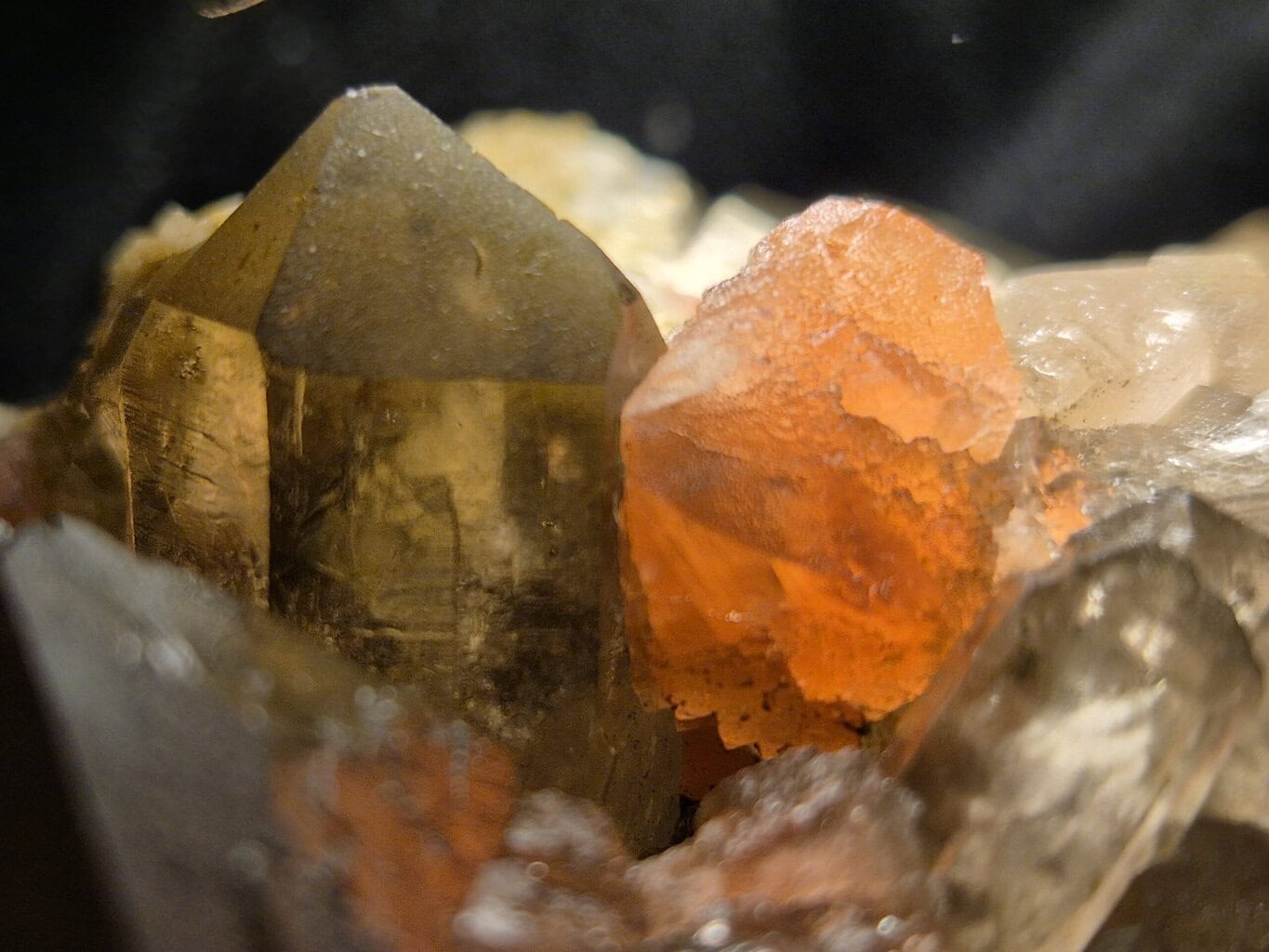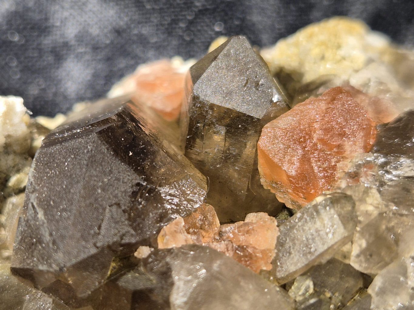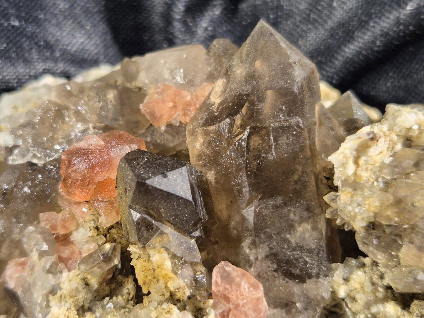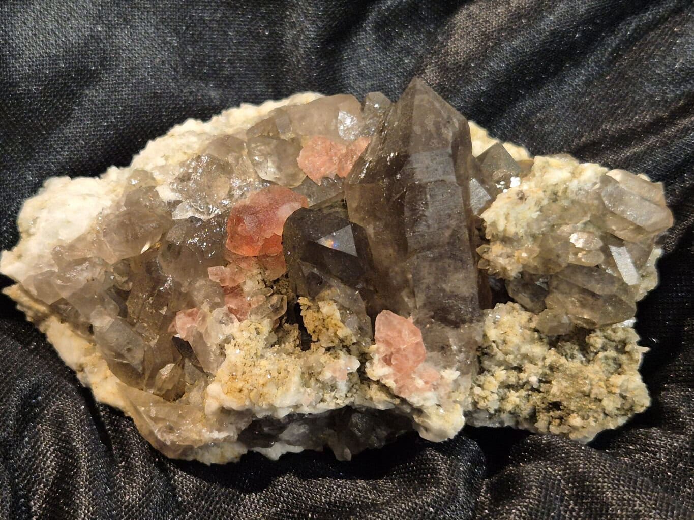 Il est courant de trouver des cristaux de fluorite rose sur une gangue de quartz fumé, créant un contraste esthétique saisissant.