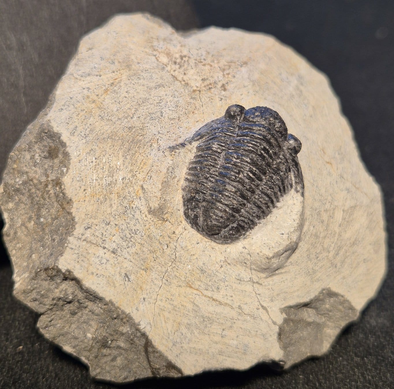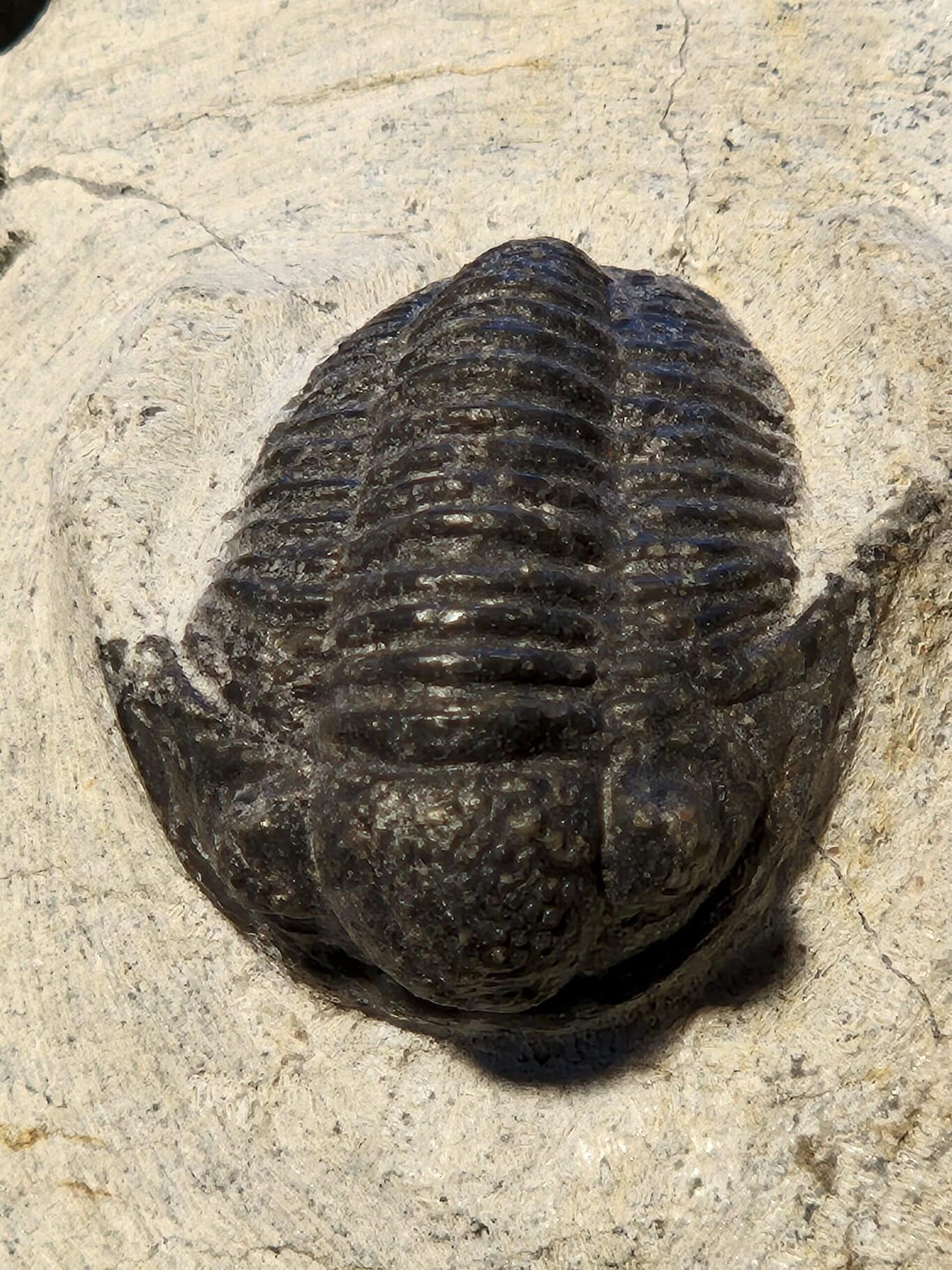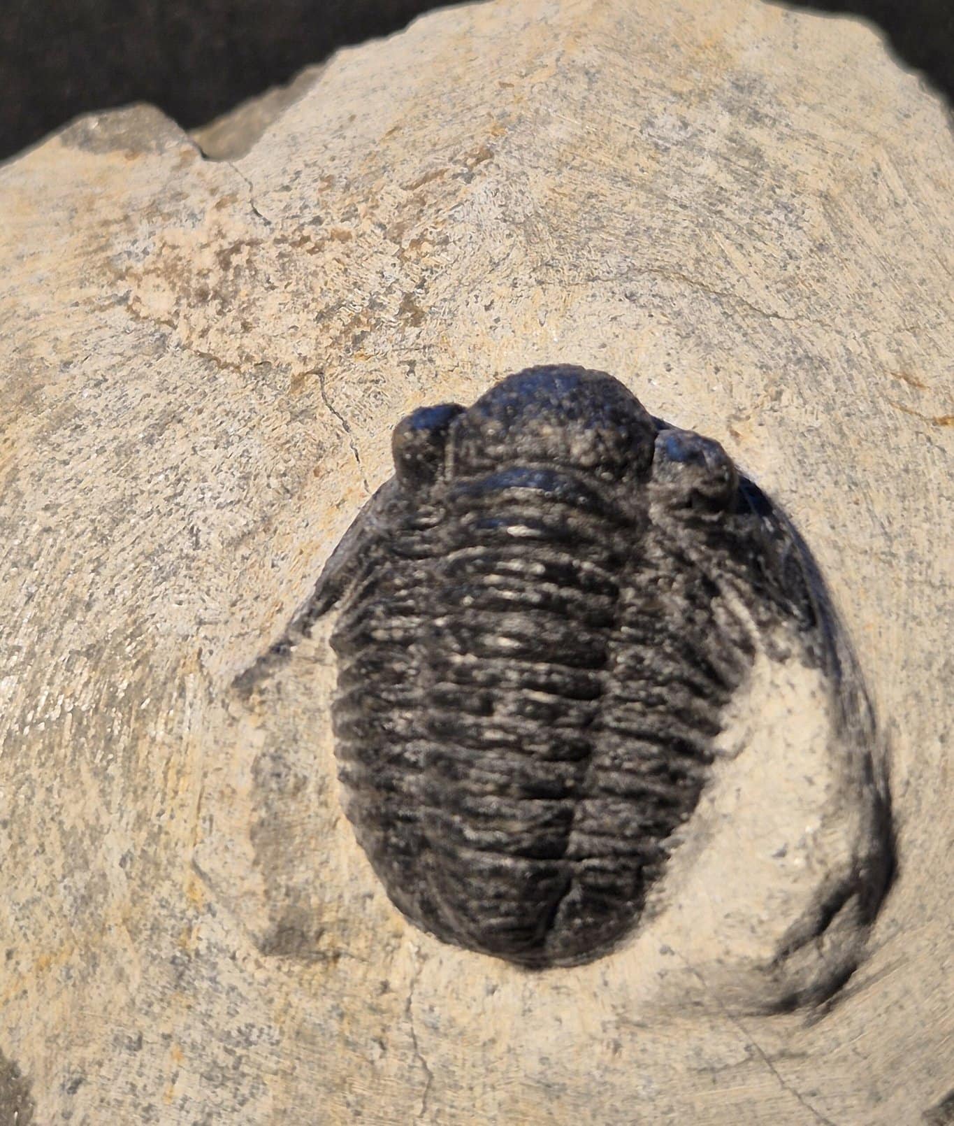 Gerastos. Spécimen complet de l’ère primaire et véritable trilobite du dévonien sur sa guangue de calcaire. Foum Ziguid, Maroc.(fossile2,5x2cm).