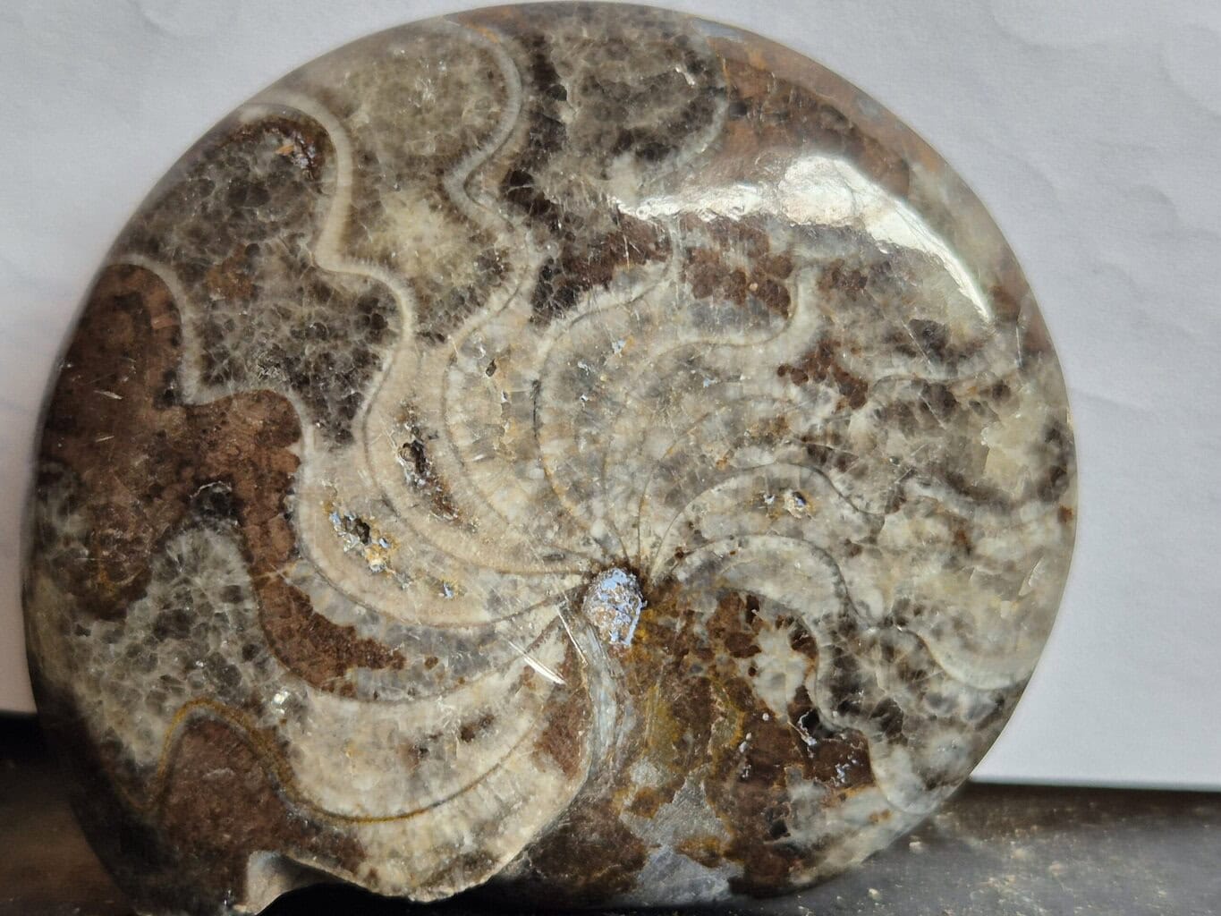 Goniatite polie. Les Goniatites représentent le groupe ancestral des Ammonoïdes, ayant donné naissance aux Cératites, puis aux Ammonites. Erfoud, Maroc.