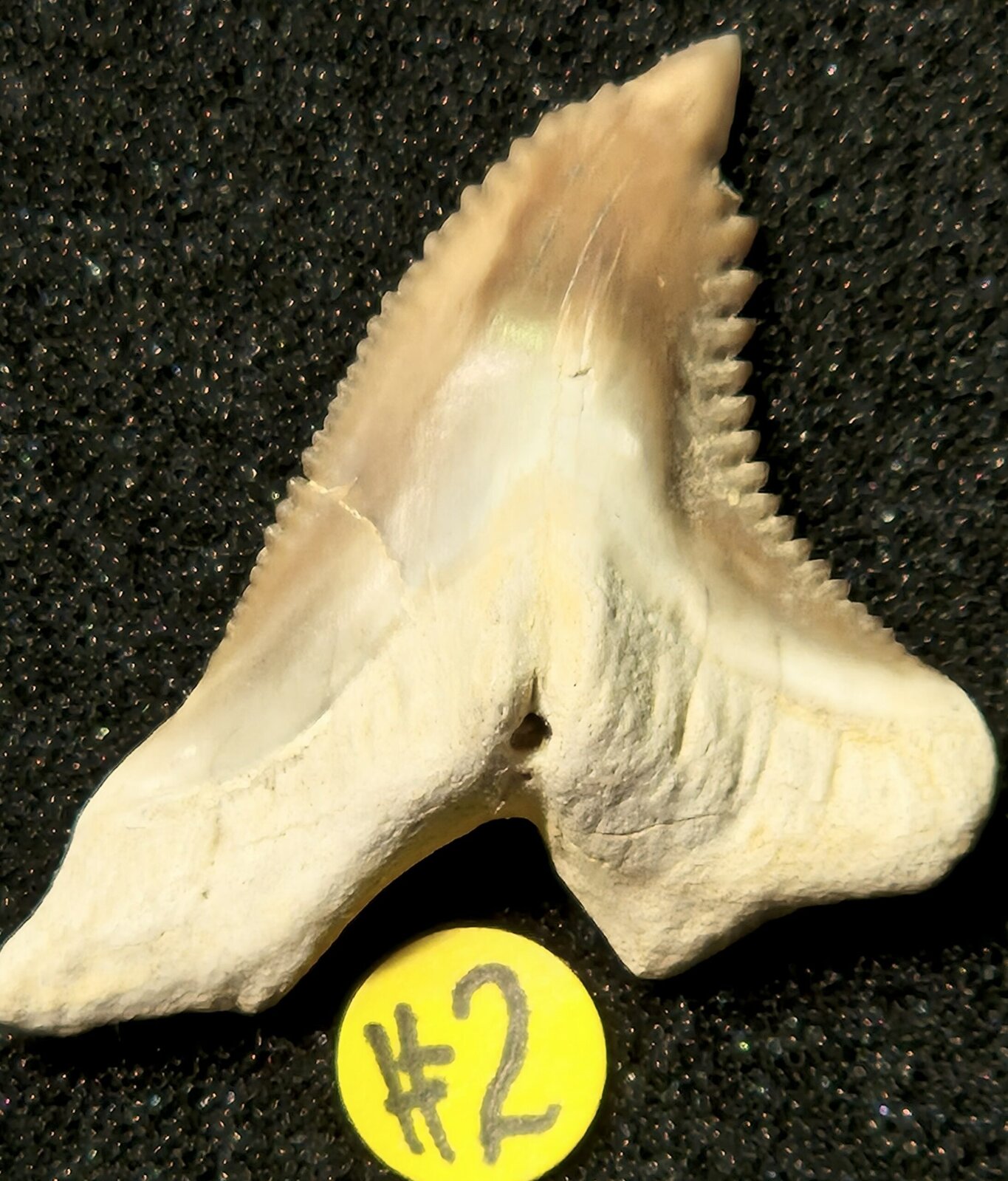 - Dents Supérieures : Elles sont larges, triangulaires et possèdent des dentelures très grandes et grossières qui s’étendent presque sur toute la lame (sauf l’apex, qui est souvent lisse).