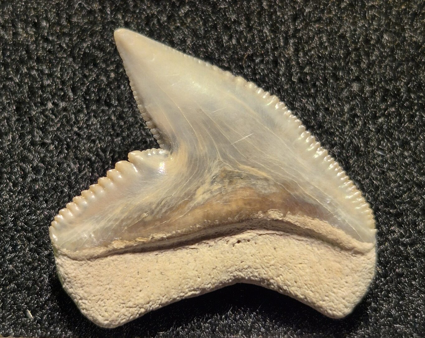 - Dents Supérieures : Elles sont larges, triangulaires et possèdent des dentelures très grandes et grossières qui s’étendent presque sur toute la lame (sauf l’apex, qui est souvent lisse).