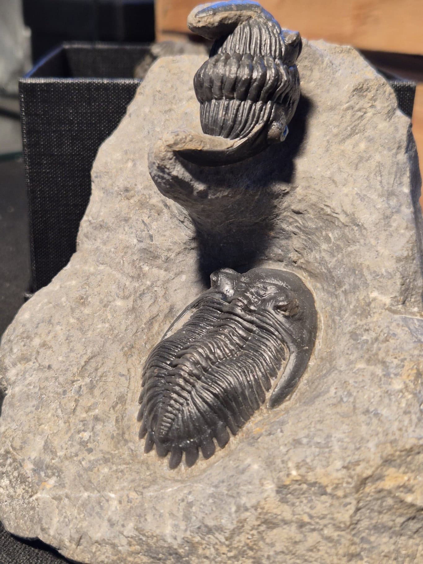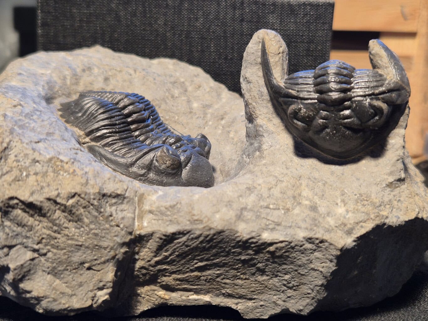 Hollardops du Dévonien. Deux jolis spécimens sur leur guangue calcaire. Période Praguien. ( – 416 à – 359 millions d’années). Ofaten, Maroc
