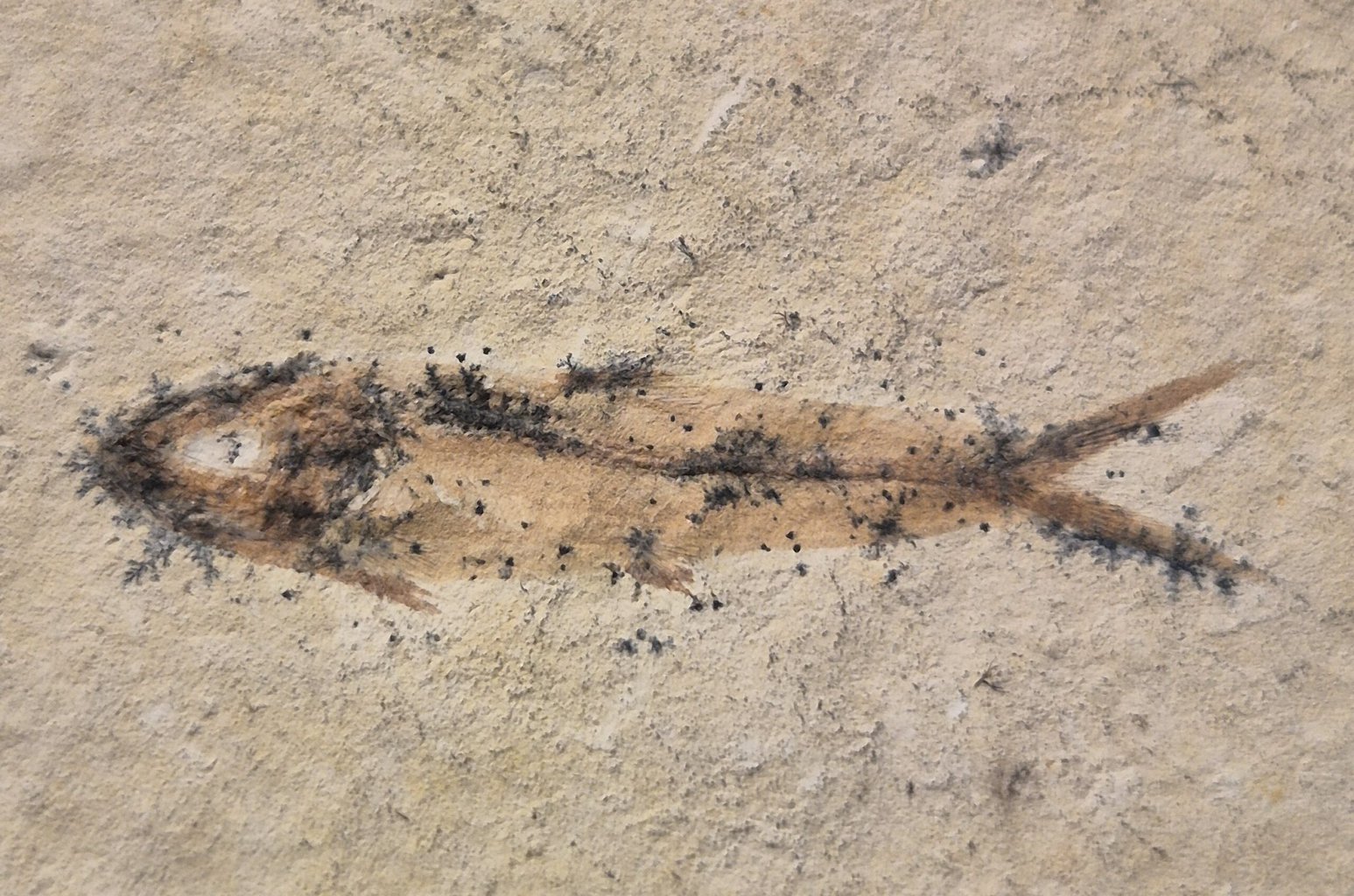 Knightia juvénile. Véritable poisson fossilisé de l’époque Eocène, Ere tertiaire, 55 millions d’années. Découverte 2022, Kemmerer, USA. Plaque11x6cm, poisson 3,5cm.