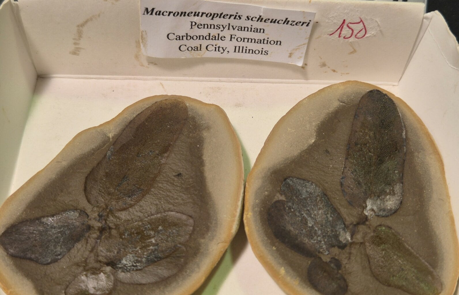Macroneuropteris schewchzeri. La zone des fossiles de Mazon Creek est criblée de filons de charbon. Les veines de charbon sont composées de couches alternées de charbon et de schiste. Chaque couche de charbon représente l’ancienne forêt, fossilisée et compressée en charbon. Les lits de schiste au-dessus et au-dessous des couches de charbon ont une profondeur de vingt à soixante pieds et représentent une période où la mer avançait et inondait les marécages dans lesquels poussaient les forêts. Les différentes strates empilées les unes sur les autres indiquent que le niveau de la mer montait et descendait un nombre de fois correspondant afin de créer l’alternance entre charbon et schiste.