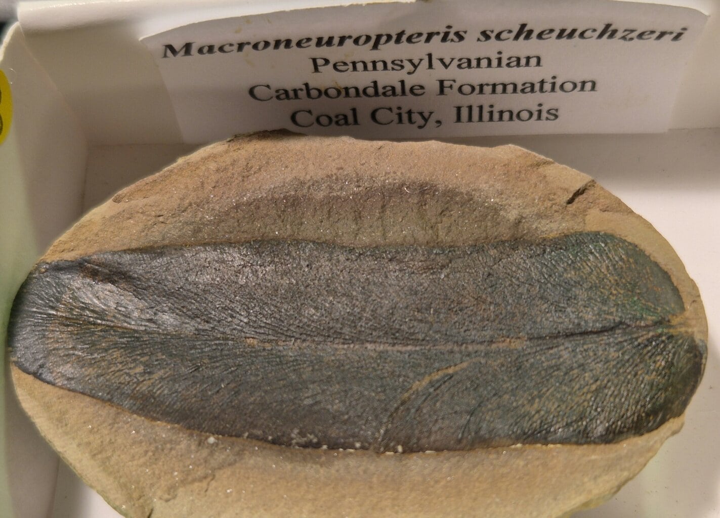 Macroneuropteris. La zone des fossiles de Mazon Creek est criblée de filons de charbon . Les veines de charbon sont composées de couches alternées de charbon et de schiste. Chaque couche de charbon représente l’ancienne forêt, fossilisée et compressée en charbon. Les lits de schiste au-dessus et au-dessous des couches de charbon ont une profondeur de vingt à soixante pieds et représentent une période où la mer avançait et inondait les marécages dans lesquels poussaient les forêts. Les différentes strates empilées les unes sur les autres indiquent que le niveau de la mer montait et descendait un nombre de fois correspondant afin de créer l’alternance entre charbon et schiste.
