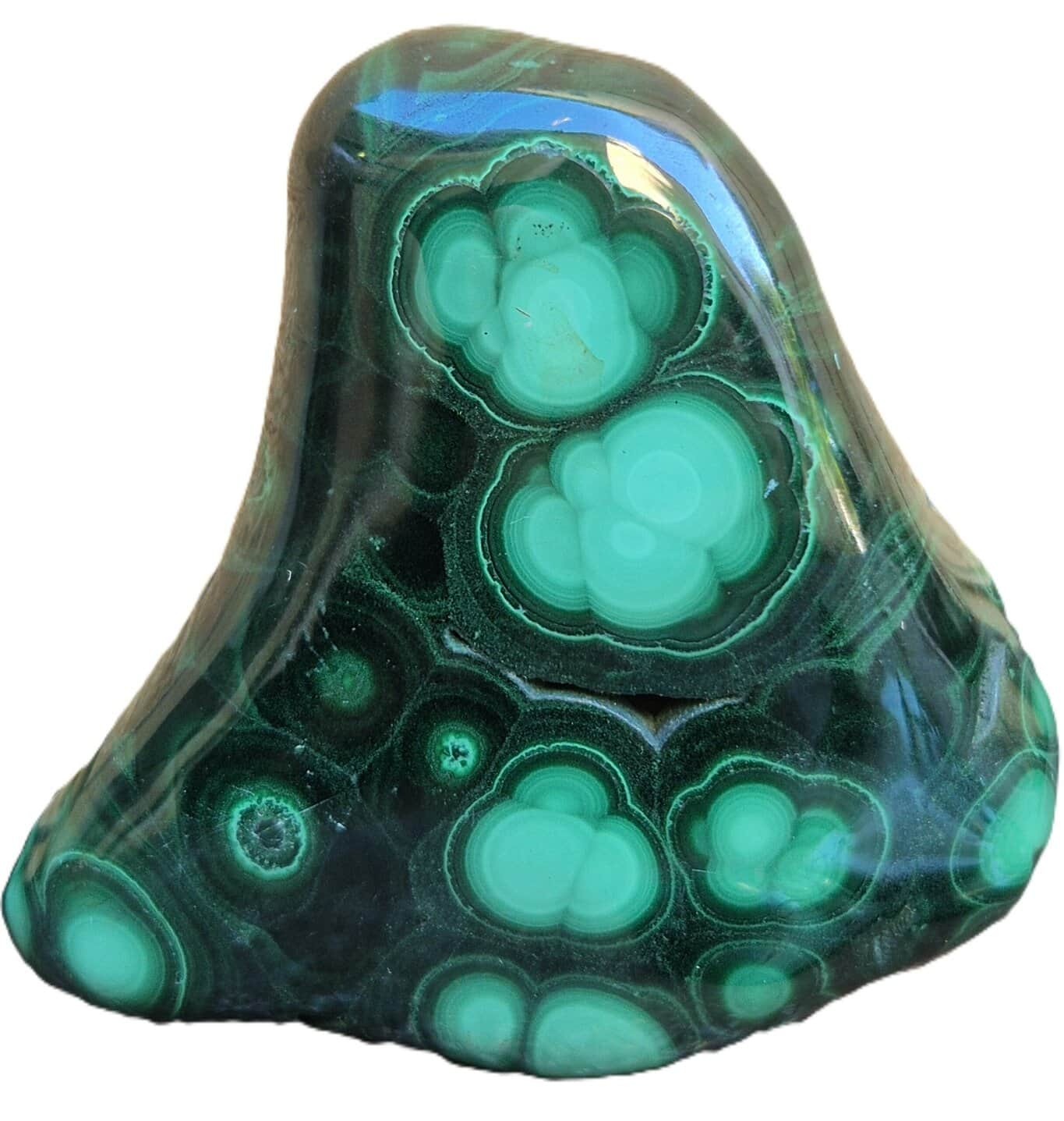 Malachite verte Afrique. Exemplaire poli montrant ses motifs concentriques de toute beauté allant du vert pâle au vert fonçé. Congo.