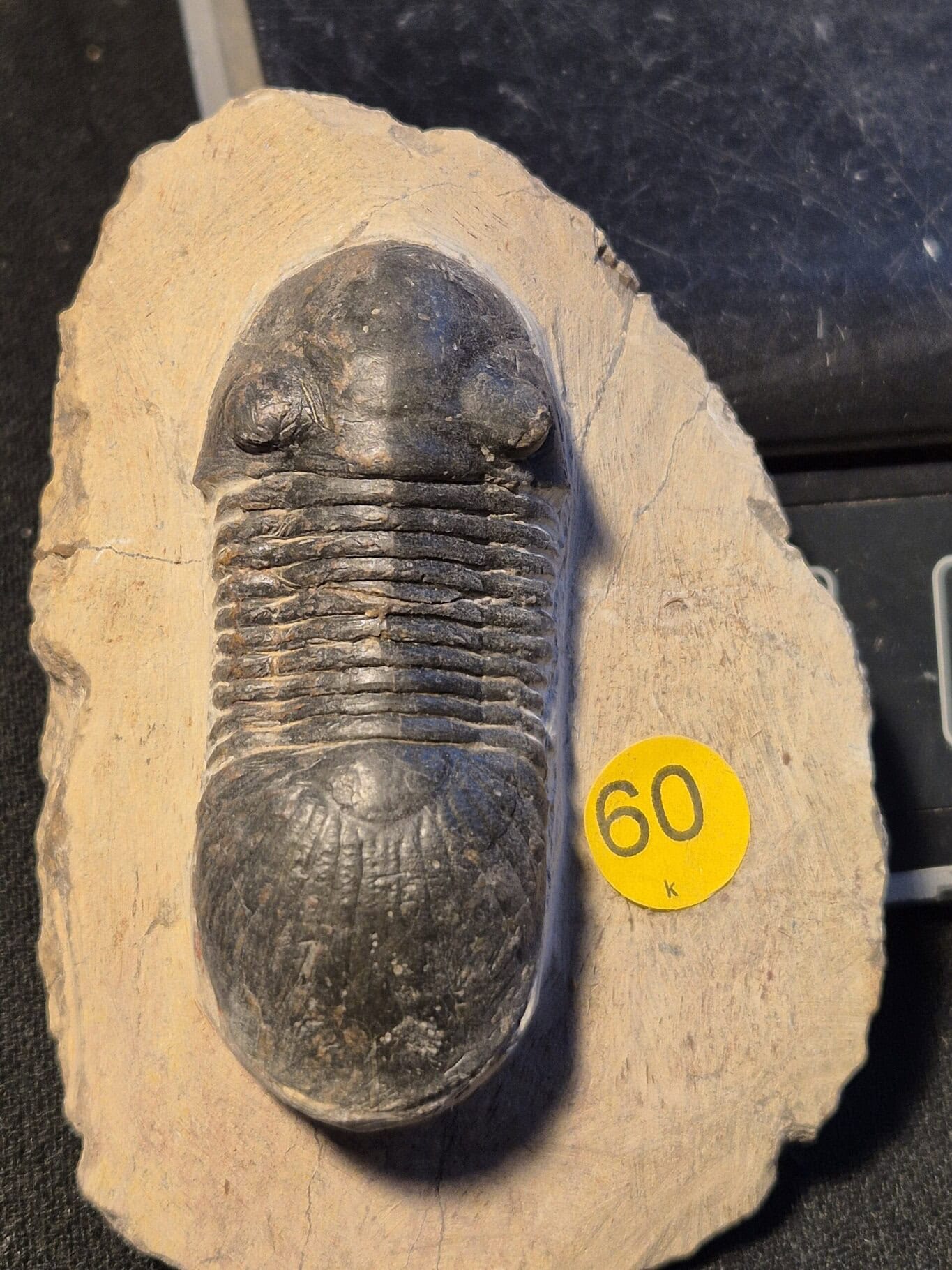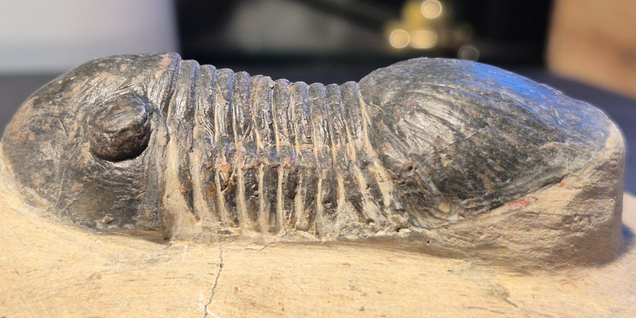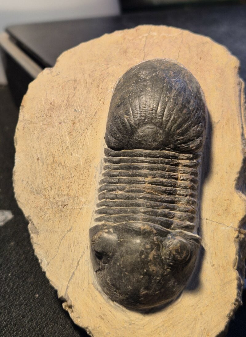 Paralejurus. Spécimen complet de l’ère primaire et véritable trilobite du dévonien sur sa guangue de calcaire. Ailnif, Maroc.Plaque 10x7cm, fossile 7x3cm