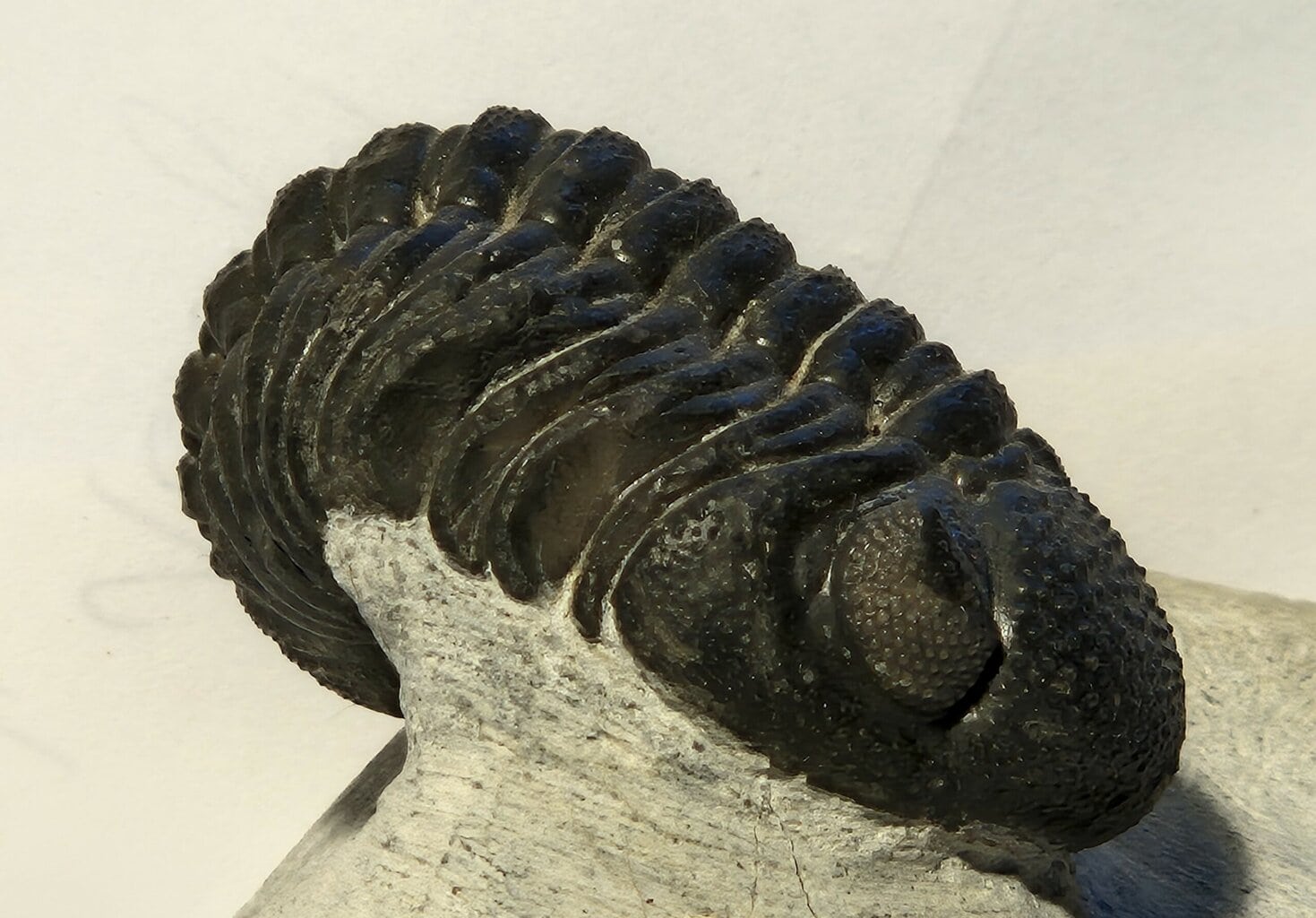 Le nom « trilobite » provient de leur structure corporelle distinctive, qui est divisée en trois lobes longitudinaux distincts. Ces lobes vont de la tête (céphale) à la queue (pygidium) et donnent au trilobite un aspect segmenté. Cette segmentation leur a permis d’avoir des corps souples et articulés, permettant mouvement et protection. Les trilobites variaient considérablement en taille, allant de quelques millimètres à plus de deux pieds de longueur, selon les espèces. Ils possédaient un exosquelette dur fait de calcite, une forme minérale de carbonate de calcium. Cet exosquelette, divisé en une série de segments articulés, offrait une protection aux parties molles du corps du trilobite. L’anatomie des trilobites révèle plusieurs caractéristiques importantes. Ils avaient une paire d’yeux composés, qui faisaient partie des systèmes visuels les plus avancés de leur époque. Certaines espèces de trilobites avaient des yeux remarquablement complexes, avec des lentilles constituées de cristaux de calcite qui leur fournissaient une vision améliorée.