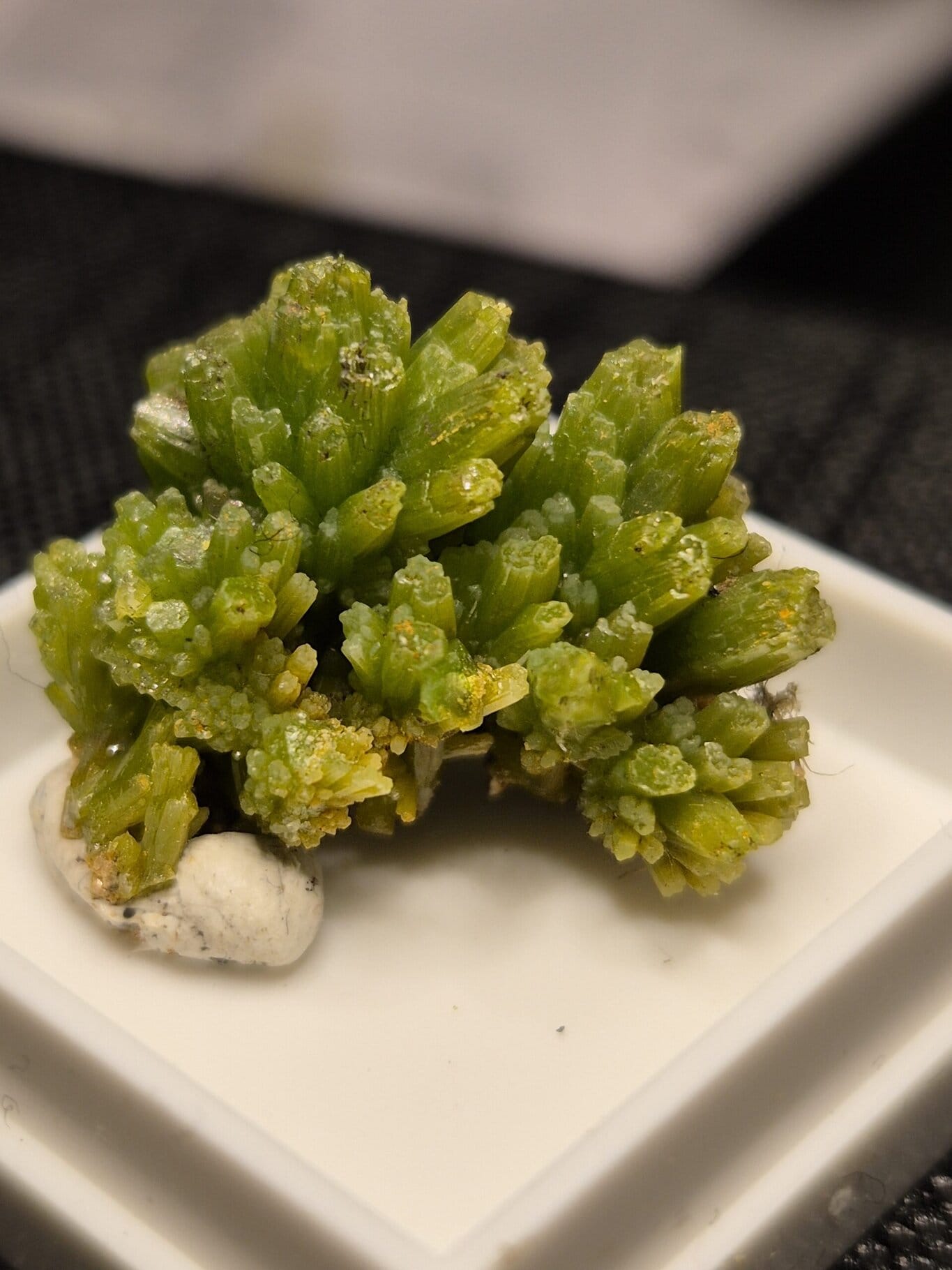 Druses denses : La pyromorphite tapisse souvent les cavités en formant des druses (tapis de petits cristaux) très denses et riches en couleur.