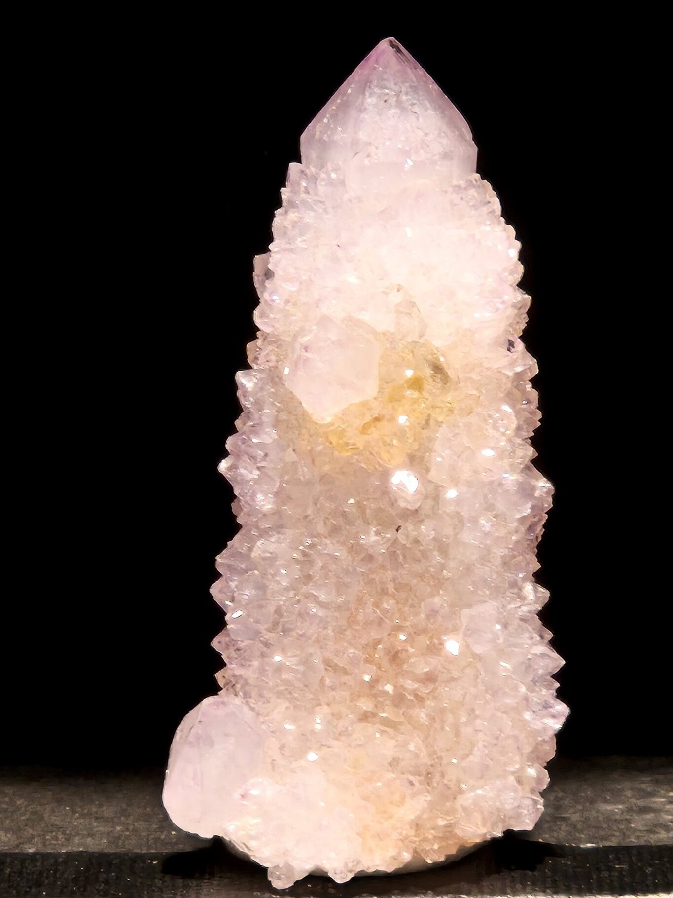 Quartz Cactus pointe longue. Pointe d’améthyste cristallisée avec une deuxième génération de cristaux. Mpumalanga, Afrique du Sud.