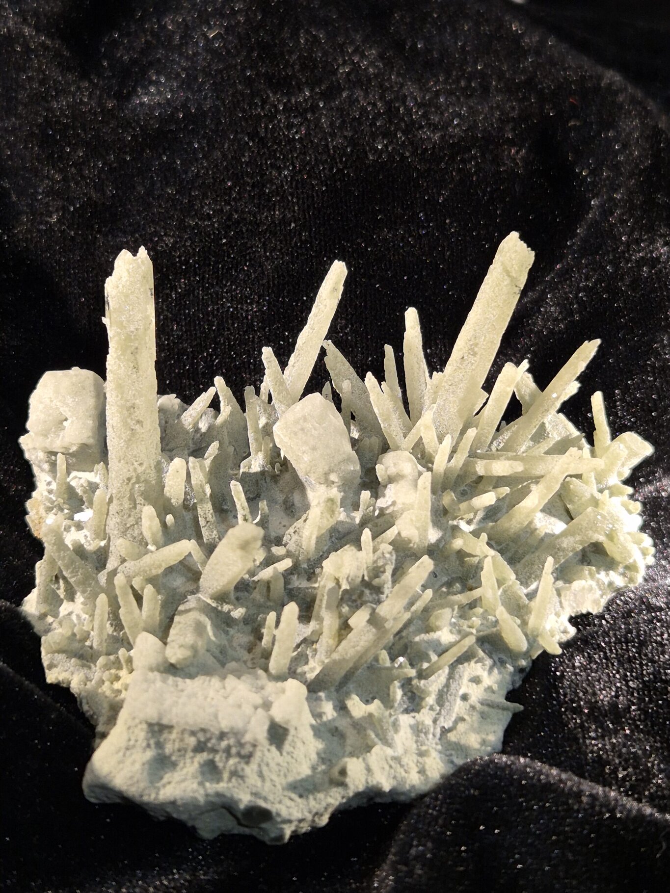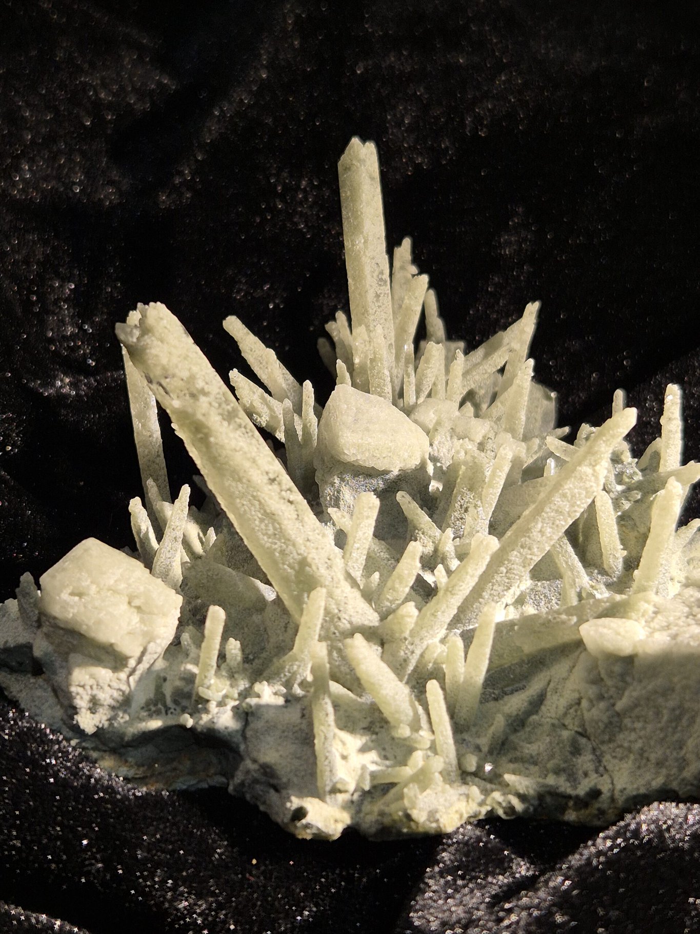 Quartz Calcite et Chlorite. Les carrières de La Mure (notamment le lieu-dit Maronne) ont été exploitées pour le calcaire sédimentaire, mais ces travaux ont révélé des géodes et des fissures spectaculaires remplies de cristaux. Les spécimens de Calcite de Maronne sont reconnus pour leur pureté, leur cristallisation et leurs associations minérales. La Calcite est un minéral commun, mais celle de Maronne se distingue par plusieurs aspects: les cristaux de Calcite de Maronne adoptent principalement des formes prismatiques et scalénoédriques. C’est la forme la plus recherchée. Ce sont des cristaux pointus, souvent allongés, dits en “dents de chien”. Plus rarement, on trouve des rhomboèdres ou des macles complexes.