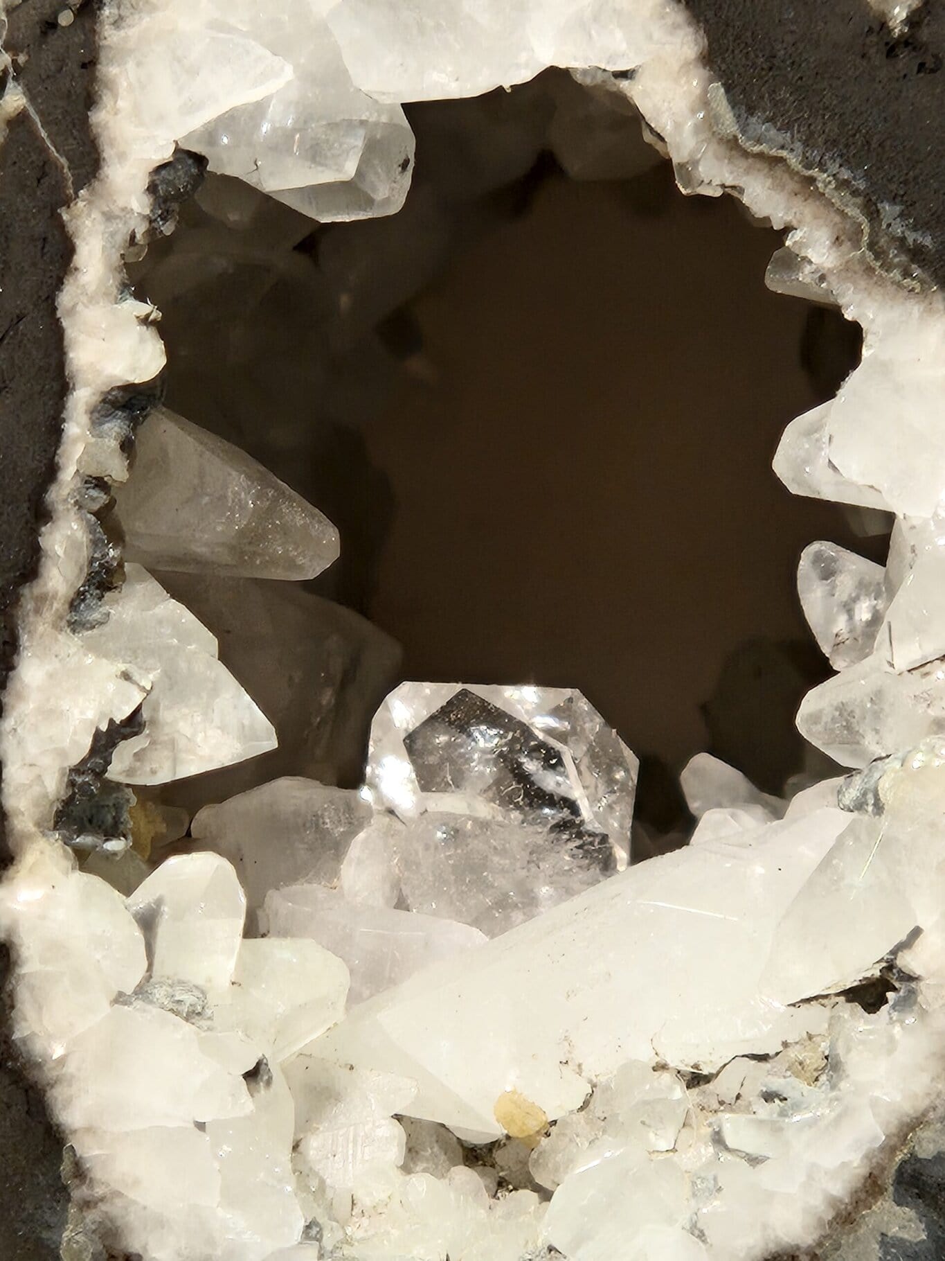 Morphologie : Le quartz s’y développe sous forme de cristaux automorphes (bien formés), souvent translucides ou clairs (cristal de roche), qui tapissent les parois des cavités.