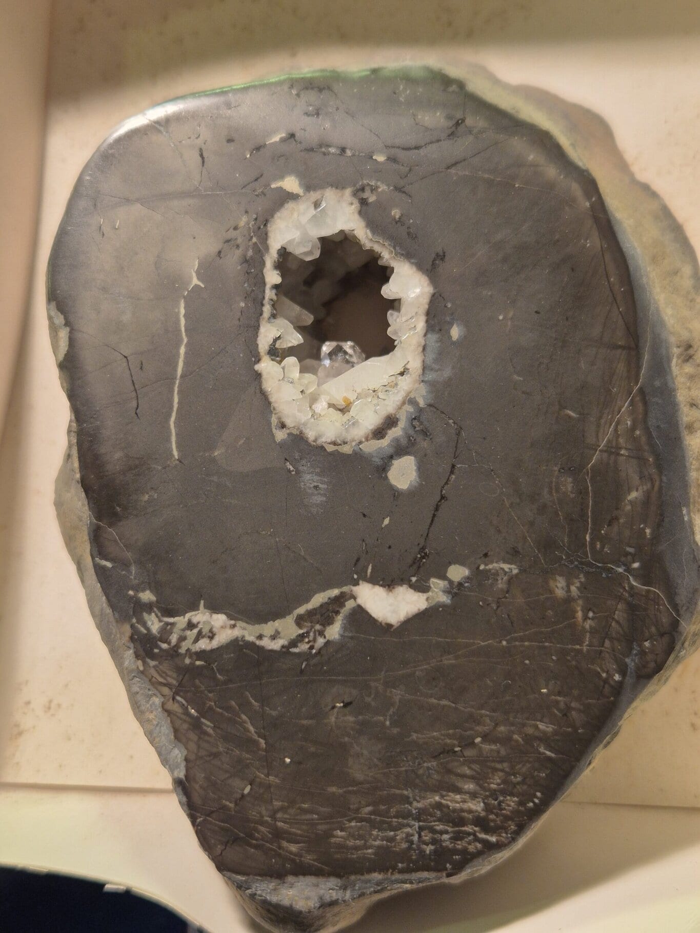 Quartz et Calcite Septarias . Une septaria (ou nodule septarien) est une concrétion sédimentaire caractérisée par un réseau de fissures internes rayonnantes et polygonales. Le terme vient du latin septum qui signifie “cloison” ou “barrière”, faisant référence aux fentes qui divisent la masse interne.