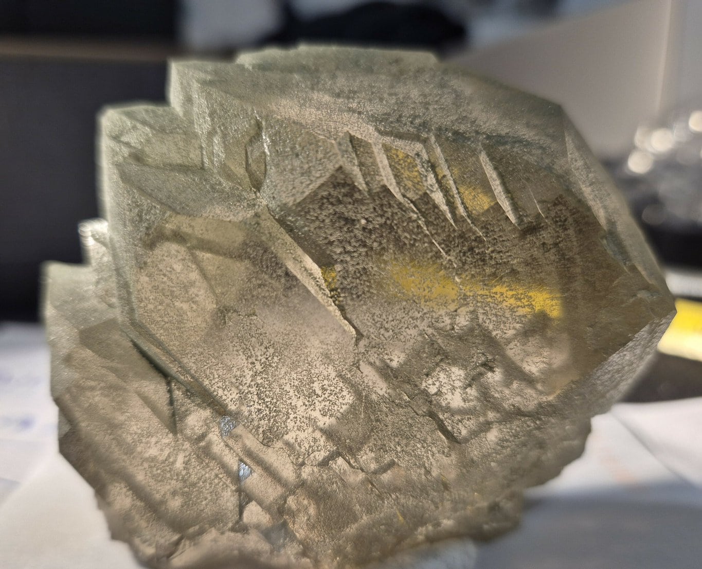 De l’eau chaude, riche en silice et autres éléments dissous, circule sous pression dans ces fissures. Le quartz SiO cristallise lentement à haute température et pression. À mesure que la solution se refroidit ou que sa chimie change, les minéraux de chlorite précipitent. Ces derniers peuvent former un fantôme ou une inclusion à l’intérieur du quartz, marquant une étape de croissance du cristal.