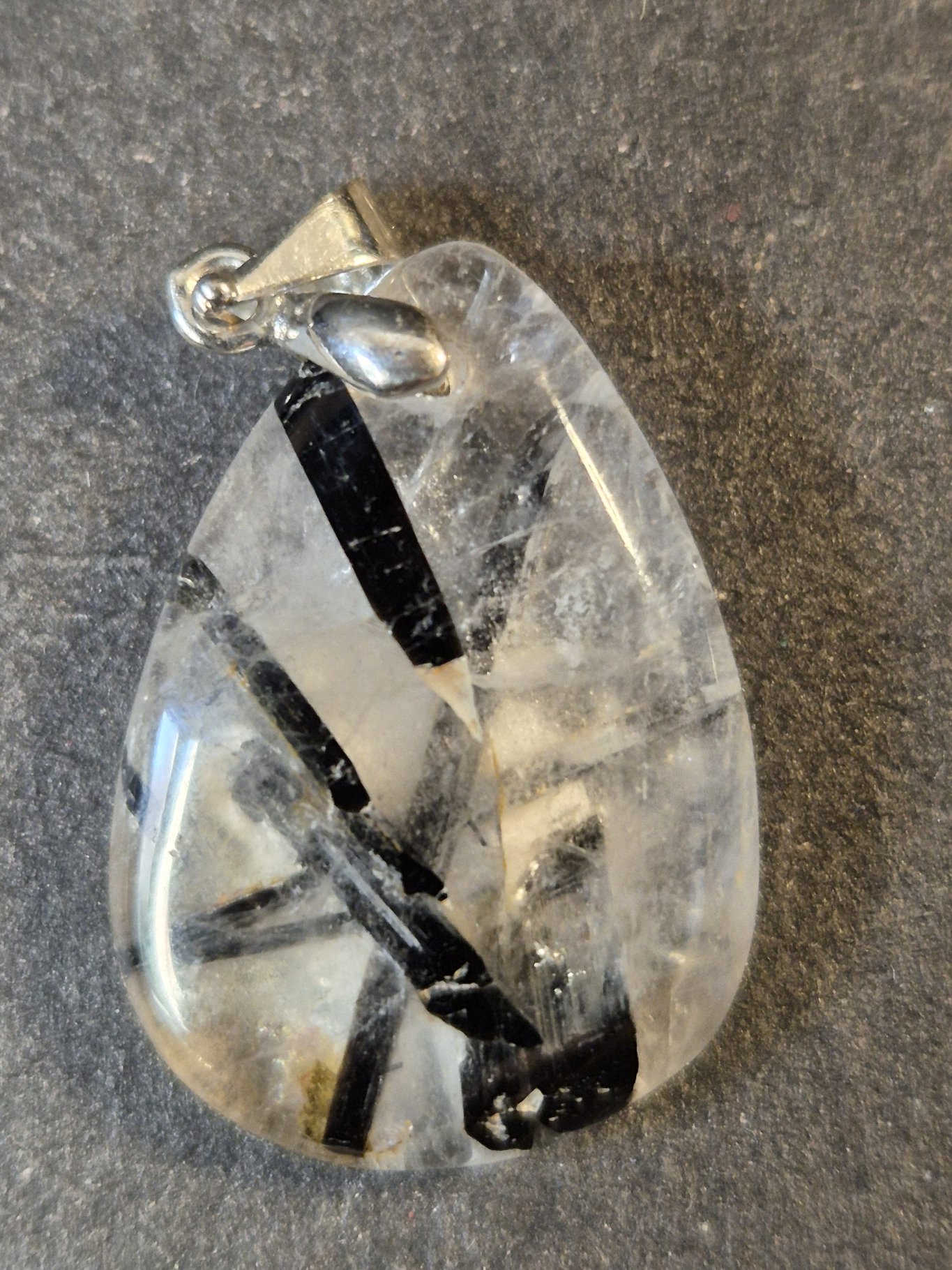 Quartz Tourmaliné pendentif goutte. C’ est une roche hybride où des cristaux de Quartz clair ou fumé ont piégé des aiguilles ou des filaments de Tourmaline noire (appelée Schorl) durant leur croissance. Cette combinaison offre un contraste visuel saisissant entre la transparence du Quartz et l’opacité des inclusions noires.